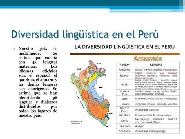 El gran legado antiguo y la cultura de Perú se expresan en la variedad de lenguas nativas que coexisten en su territorio. El español es el idioma official y se usa en gran parte del país. También son parte de la cultura del Perú y reconocidos constitucionalmente: el quechua, que se habla en varias regiones andinas con sus respectivas variantes, y el aymara predominante en el sur andino. El shipibo, el ashaninka, el aguaruna, utilizadas por comunidades de la Amazonía, son algunas de las 43 lenguas nativas identificadas en el país.